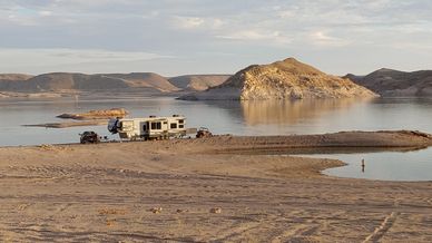Boondocking on BLM land north of Lake Havasu. Had a perfect view of the Crab Crawl rock. Looks like a glove to me. Washboard ATV trails to the Bunker Bar - a must see.